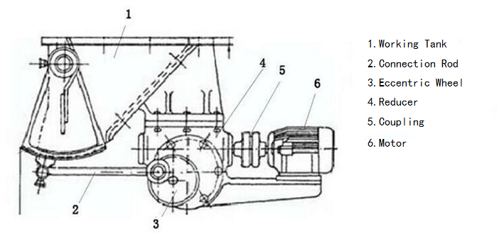 This machine uses the principle of eccentric wheel mechanism to make jaw plate do periodic reciprocating motion to convey material continuously and evenly. Its original power is to rely on the motor to drive the eccentric wheel through the turbine reducer, and then link the circular motion into reciprocating motion, driving the jaw plate reciprocating motion. When the jaw plate swings clockwise, the material accumulated on it is driven to move together by friction, and a part of new material is dropped from the bucket to fill the space formed outside the body. When the jaw plate moves counterclockwise, the material can no longer follow the jaw plate into the body because of the obstruction of the internal material, so it is pushed under it. In the feeding hopper of conveyor or conveyor, with the periodic swing of jaw plate, the continuous uniform feeding of material can be made.