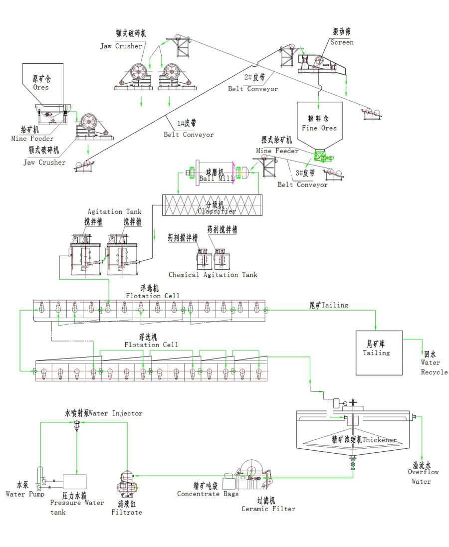 2. Flotation process of fluorite ore is suitable for refractory fluorite ore with complex ore properties, such as high mud content of raw ore, coexistence of impurity minerals and fluorite, fine particle size of useful minerals.