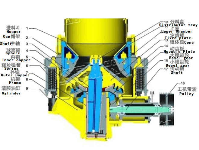 Crusher is mainly composed of frame, fixed cone assembly, moving cone assembly, spring mechanism, bowl-shaped shafting, and transmission, and its auxiliary part is composed of electrical system, oil lubrication system and hydraulic cavity cleaning system.